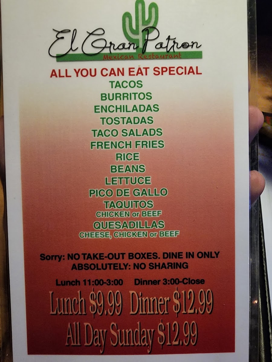 Customers appreciate the attentive staff, though some noted a desire for a more uniform appearance. This establishment also offers unique entertainment, including live country music and engaging trivia nights that create a lively dining environment. While there’s room for improvement in certain dishes, such as enhancing salsa flavor with fresh ingredients, the overall experience remains delightful. Whether you’re seeking delicious food or a festive night out, EL Gran Patron is worth a visit.